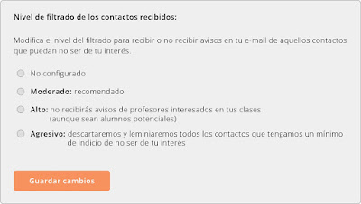 2. Alto. Empezamos a filtrar los contactos realizados por profesores. Esto significa que no te notificaremos a tu email personal ningún contacto que recibas de un profesor, tanto los que se ofrecen para trabajar, como aquellos que quieren recibir clases, a no ser que tengas publicada una oferta de empleo.